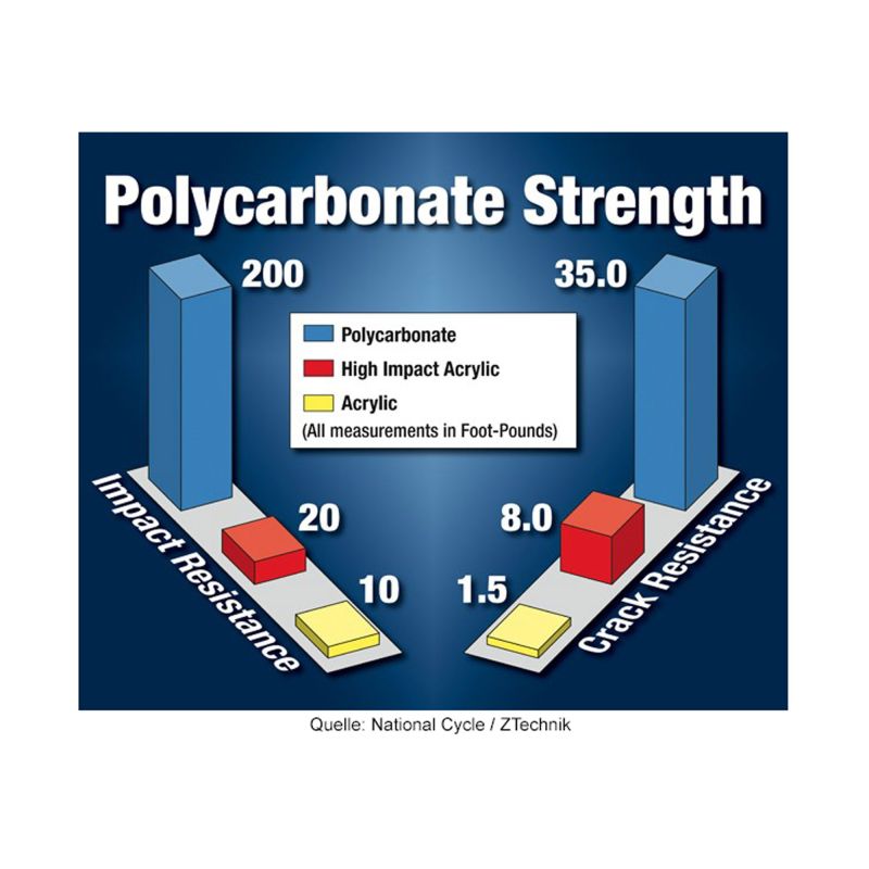 Le pare-brise de tourisme en polycarbonate Lexan® high-tech de 4,5 à 6 mm d'épaisseur est doté d'un revêtement Quantum et est donc dix fois plus résistant aux rayures, deux fois plus incassable et deux fois plus résistant aux UV que l'acrylique