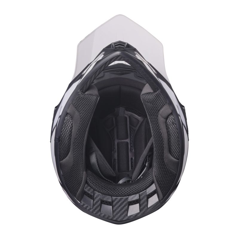 Le déflecteur s'applique sur le dessus du casque et vient prolonger la visière empêchant au maximum les projections de terre et de boue.