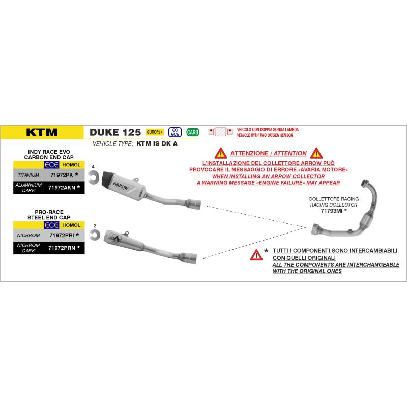 Échappement ARROW PRO-RACE homologué pour KTM 125 DUKE avec raccord pour collecteur d'origine