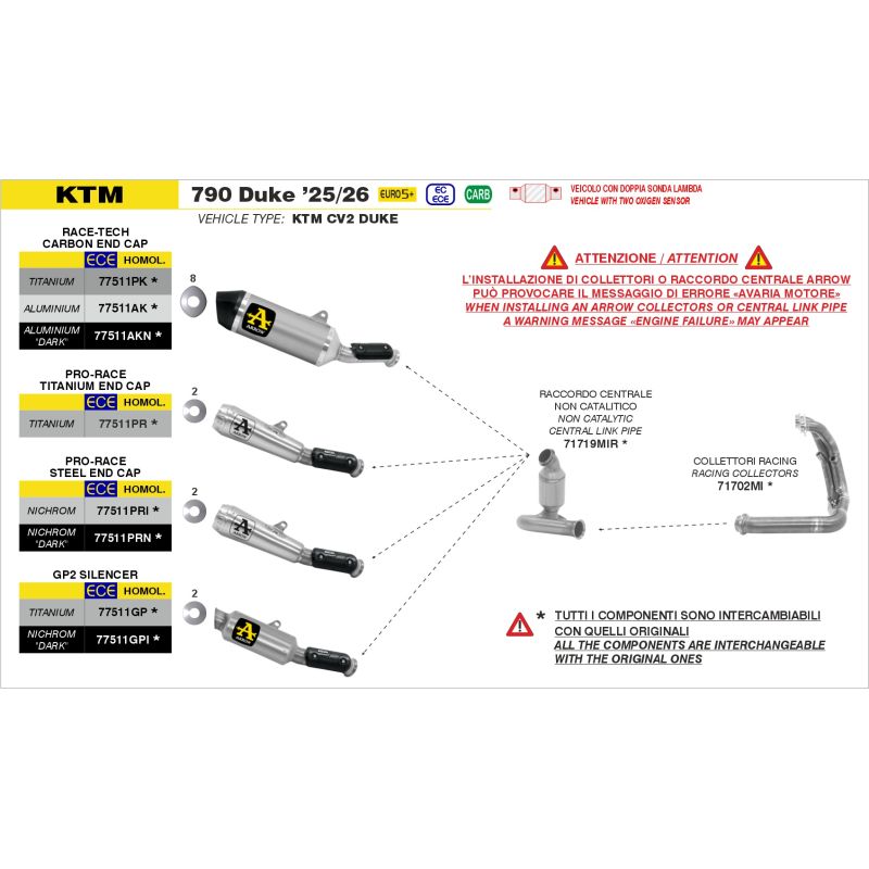 ARROW est toujours attentif aux exigences croissantes des usagers qui réclament la possibilité de s'équiper de systèmes d'échappements homologués, tout en garantissant de bonnes prestations et un look réussit.