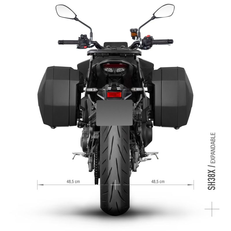 Paire de valises moto SHAD le SH38X Extensible pour créer un ensemble de bagages qui se distingue par son mécanisme extensible breveté