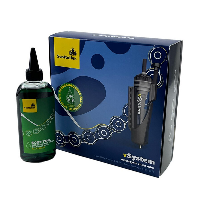 Le Scottoiler vSystem Universal Edition est un graisseur de chaîne sous vide qui lubrifie automatiquement votre chaîne lorsque vous roulez. Ce kit contient un Scottoil de 250ml. Vous pouvez choisir entre notre Scottoil bleu standard (0-30°C), notre Scottoil rouge haute température (20-40°C), ou le nouveau Scottoil vert biodégradable ( toutes conditions météorologiques).