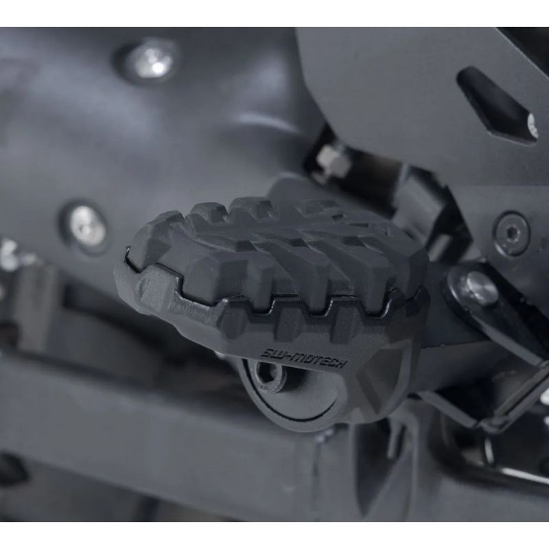 Paire de repose-pieds SW-MOTECH EVO réglable. Un système ingénieux, composé d’éléments rotatifs à dents fixes qui s'emboîtent, qui permet 36 positions différentes.