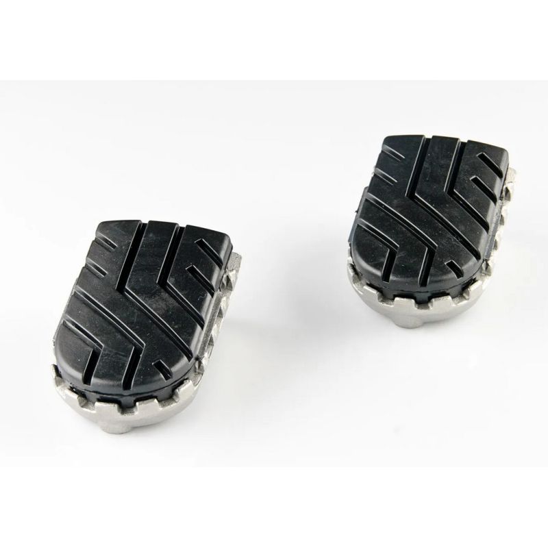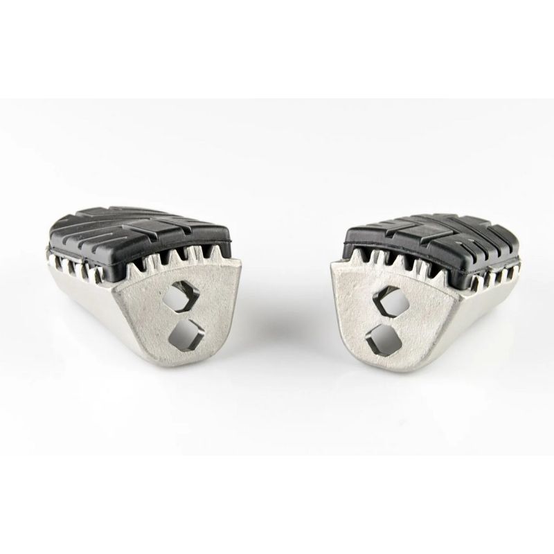 Nos kits de repose-pieds à prix abordable permettent d'installer le repose-pied à sa hauteur d'origine ou 15 mm plus bas. Extrêmement robustes et durables, les repose-pieds en acier inoxydable offrent une très excellente adhérence et sont recommandés pour les motos d'aventure, de route et off-road. Des charnières en alliage d'aluminium à haute résistance permettent au repose-pieds de se replier lorsque la moto se renverse. Un patin en caoutchouc amovible réduit les vibrations, le profil offre une bonne adhérence, même en off-road. Pour monter les adaptateurs charnières spécifiques à chaque modèle sur les supports de repose-pieds, le matériel de fixation d'origine est utilisé (ressorts, boulons...).