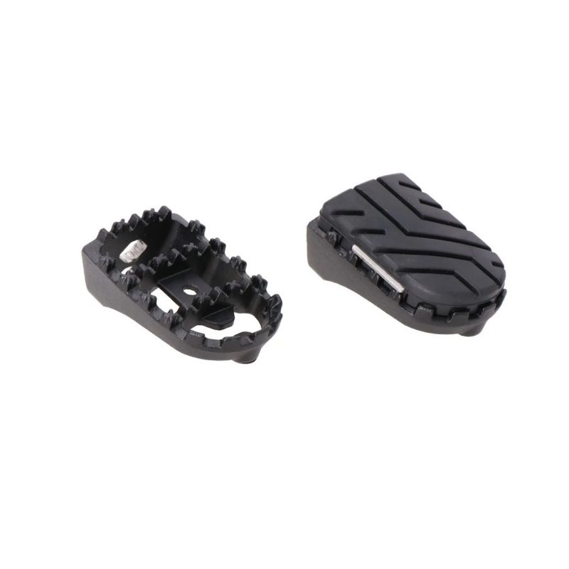 Nos kits de repose-pieds à prix abordable permettent d'installer le repose-pied à sa hauteur d'origine ou 15 mm plus bas. Extrêmement robustes et durables, les repose-pieds en acier inoxydable offrent une très excellente adhérence et sont recommandés pour les motos d'aventure, de route et off-road. Des charnières en alliage d'aluminium à haute résistance permettent au repose-pieds de se replier lorsque la moto se renverse. Un patin en caoutchouc amovible réduit les vibrations, le profil offre une bonne adhérence, même en off-road. Pour monter les adaptateurs charnières spécifiques à chaque modèle sur les supports de repose-pieds, le matériel de fixation d'origine est utilisé (ressorts, boulons...).