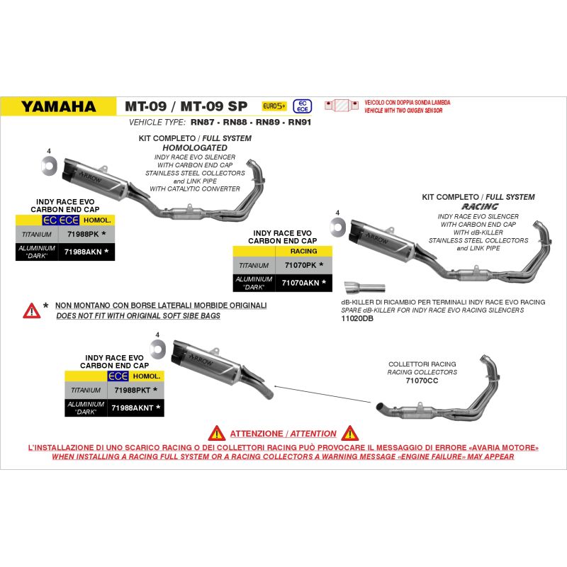 Échappement ARROW INDY RACE homologué catalysé pour moto YAMAHA MT-09 Collecteur inox et silencieux indy race evo
