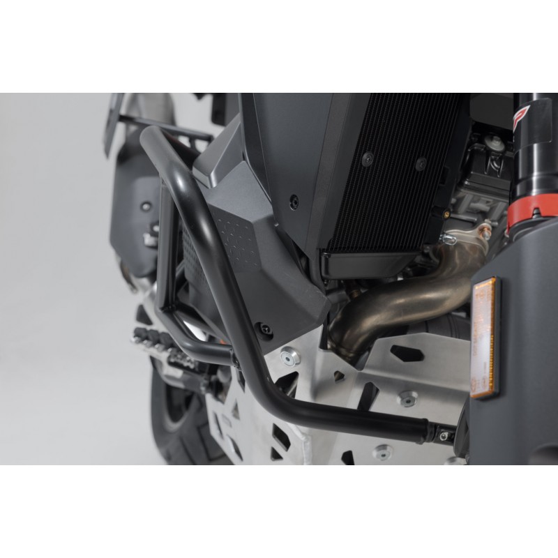 Des crashbars en acier inoxydable avec finition époxy, résistant aux intempéries et à la corrosion, et compatibles au modèle spécifique de la moto, sont disponibles en noir. Le traitement de surface est réalisé dans une installation ultramoderne située dans l'usine SW-MOTECH de Brno en République tchèque.