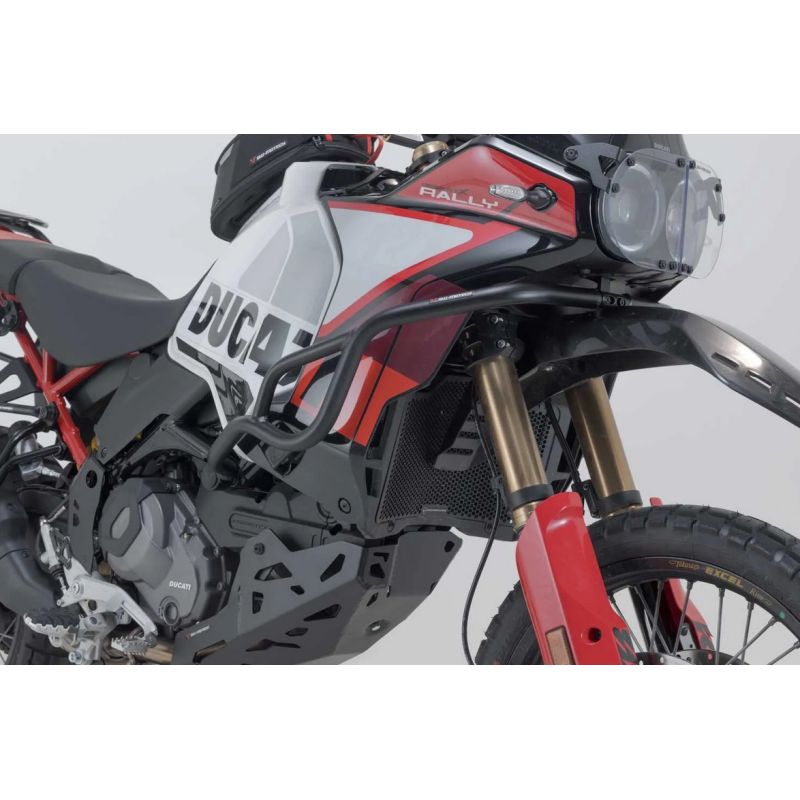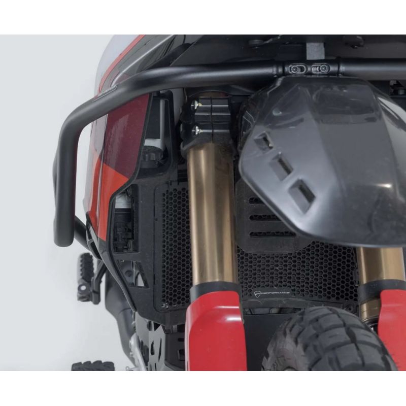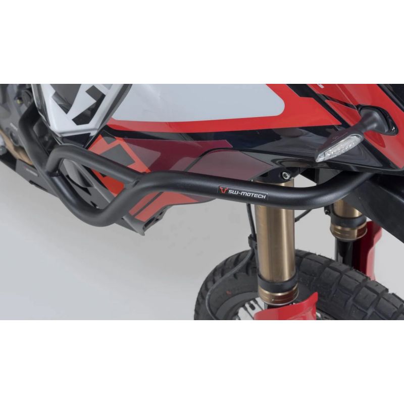 Des crashbars en acier inoxydable avec finition époxy, résistant aux intempéries et à la corrosion, et compatibles au modèle spécifique de la moto, sont disponibles en noir. Le traitement de surface est réalisé dans une installation ultramoderne située dans l'usine SW-MOTECH de Brno en République tchèque.